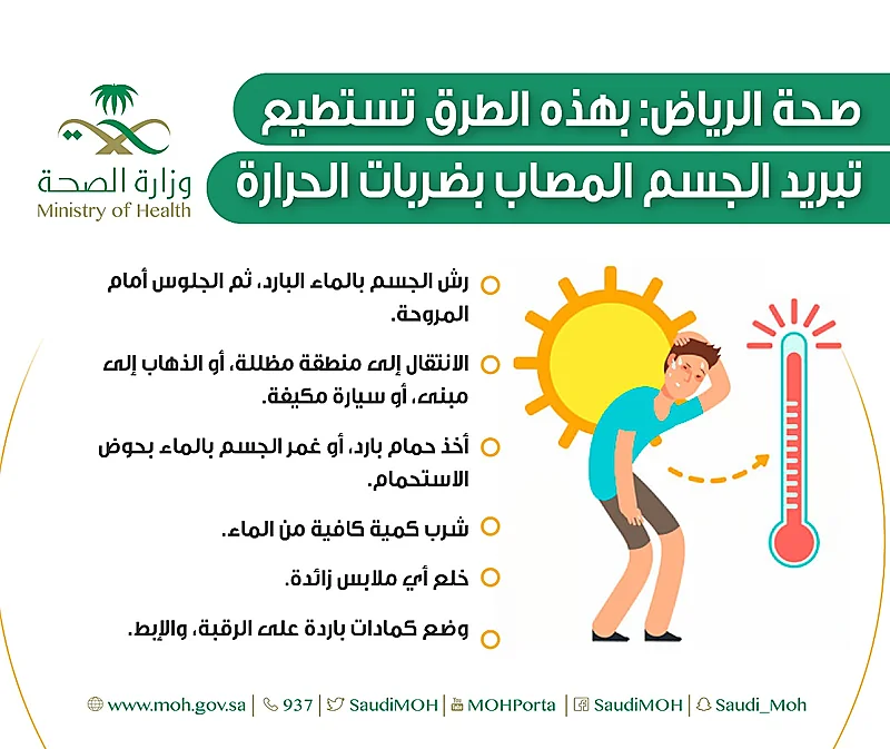 وقالت "صحة الرياض": هناك خطوات بسيطة وطرق لتبريد الجسم في حالات الاصابة بضربات الحرارة تشمل: رش الجسم بالماء البارد، ثم الجلوس أمام المروحة، الانتقال إلى منطقة مظللة أو الذهاب إلى مبنى أو سيارة مكيفة، مع أخذ حمام بارد، أو غمر الجسم بالماء بحوض الاستحمام، وشرب كمية كافية من الماء، وخلع أي ملابس زائدة، وضع كمادات باردة على الرقبة، والإبط.