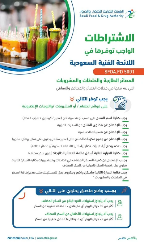 أكدت هيئة الغذاء والدواء على ضرورة توفر الإشتراطات في العصائر والمشروبات والخلطات المقدمة بالمطاعم وفقاً للائحة الفنية السعودية ، وهي كالتالي: