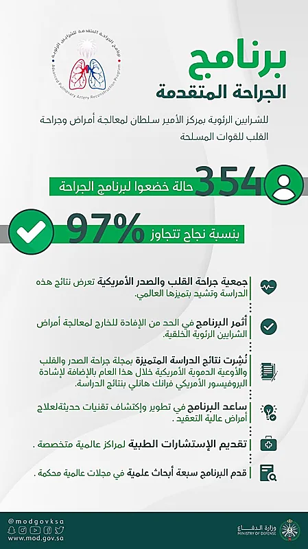 وانطلق برنامج الجراحة المتقدمة للشرايين الرئوية في شهر يوليو من عام 2019م بمركز الأمير سلطان لمعالجة أمراض وجراحة القلب للقوات المسلحة بدعم وتوجيه من قبل صاحب السمو الملكي الأمير محمد بن سلمان بن عبدالعزيز ولي العهد نائب رئيس مجلس الوزراء وزير الدفاع - حفظه الله - والذي يعد برنامجاً وطنياً يهدف إلى تقديم العلاج الطبي والجراحي عالي التخصص ضمن المنظومة الصحية داخل المملكة.