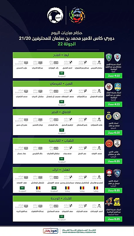 أعلن الإتحاد السعودي لكرة القدم حكام مباريات اليوم الجمعة بالجولة الـ 22 من دوري المحترفين .