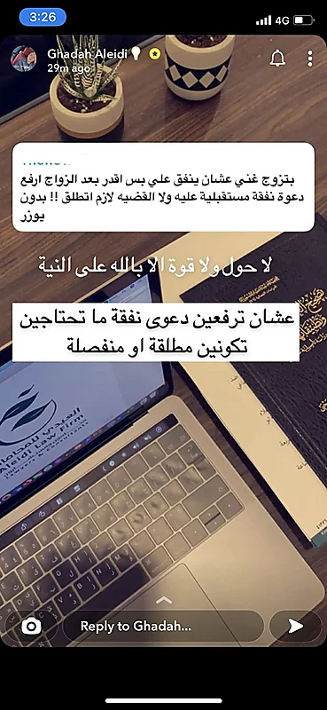 ووجهت "السيدة" تساؤل للقانونية عبر حسابها على "سناب شات" قائلة: "بتزوج من غني عشان ينفق علي بس أقدر بعد الزواج أرفع دعوة نفقة مستقبلية ولا القضية لازم اتطلق ؟".