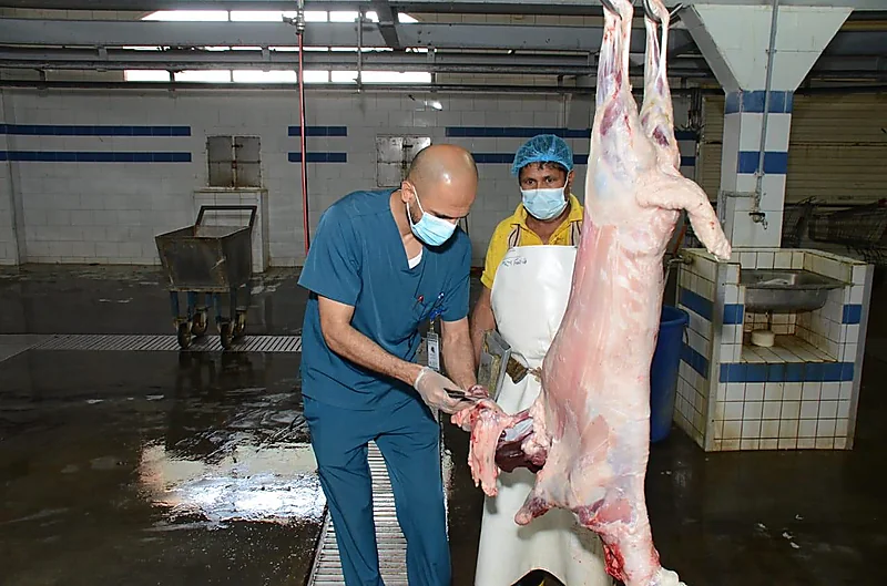 وزاد بأنه تم عمل خطة متكاملة لعمل المسالخ المركزية في حاضرة الدمام، حسب الاقبال التي ستشهده المسالخ خلال أيام عيد الفطر المبارك، حيث تم وضع خطة رقابية صحية تضمن عدم التزاحم والتنظيم وتحقيق مبدأ التباعد الجسدي للمستفيدين للوقاية من فايروس "كورونا "، وكذلك ضمان رضا المستفيدين ولاستيفاء الشروط الصحية والفنية والتي توفر بيئة مناسبة لتداول اللحوم حسب الشروط والمواصفات، بالإضافة إلى العمل على التوعية والإرشاد للمستفيدين داخل المسلخ، حيث تم توزيع طاقم العمل في المسالخ لتغطية جميع ساعات العمل وخصوصا أوقات الذروة بكفاءة عالية بما فيه من أطباء بيطريين ومشرفين وجزارين وعمال نظافة وعمال التحميل وسائقي السيارات المبردة، مشيرا الى أن طاقم عمل مسلخ الدمام المركزي يتكون من ٨٦ شخص من أطباء، وجزارين، وعمال، موزعين على ثلاث صالات للذبح.