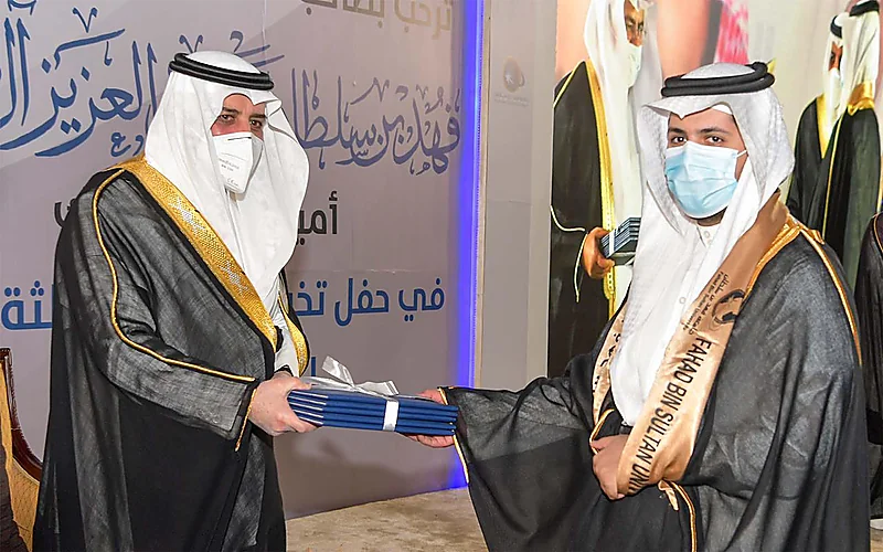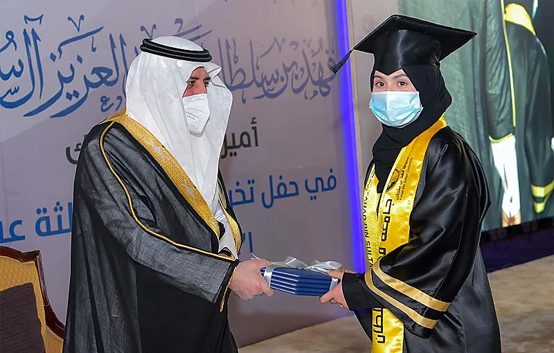 رعى صاحب السمو الملكي الأمير فهد بن سلطان بن عبدالعزيز أمير منطقة تبوك رئيس مجلس أمناء جامعة فهد بن سلطان مساء أمس ، حفل تخريج الدفعة الـ 13 من طلاب وطالبات الجامعة من حملة درجة البكالوريوس ، والدفعة الثامنة من حملة الماجستير للعام الجامعي 1441 /1442هـ ، والبالغ عددهم 465 طالب وطالبة , حيث كان في استقبال سموه لدى وصوله لمقر الجامعة رئيس الجامعة الدكتور محمد بن عبدالله اللحيدان.