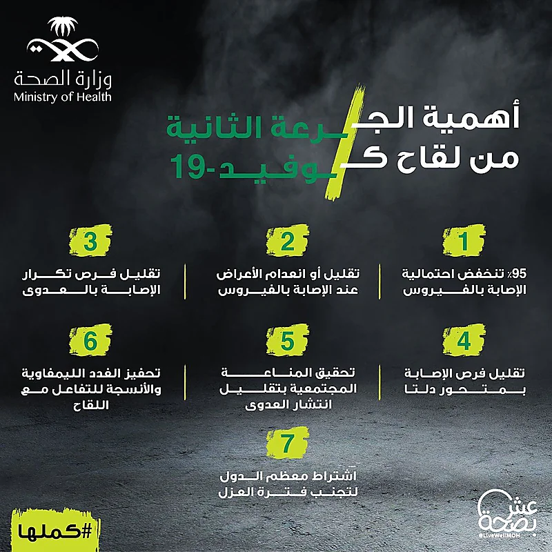 وقال عادل باعيسى، إن الجرعة الثانية من لقاح كورونا مهمة لاستدامة المناعة، ومقاومة متحورات الفيروس ويجب على الجميع استكمال تلقي الجرعتين من اللقاح،وأنها هي السبيل الوحيد لزيادة الحماية من الإصابة الشديدة بالمتحورات ورفع مستوى المناعة وتنشيطها بعد الجرعة الأولى، وهي مهمة لتحقيق المناعة المجتمعية.