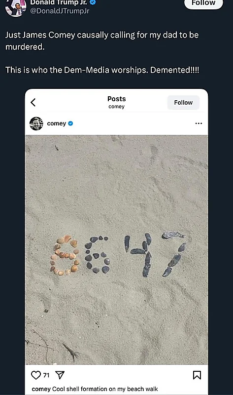 تقوم الخدمة السرية الأميركية المختصة بحماية الرئيس الأميركي، دونالد ترمب، بإجراء تحقيقات بعد أن نشر مدير مكتب التحقيقات الفيدرالي السابق، جيمس كومي، صورة على موقع "إنستغرام" لأصداف بحرية تم ترتيبها لتشكيل الأرقام "47 86" وهي شيفرة سرية فُسرت على إنها دعوة لاغتيال ترامب.
