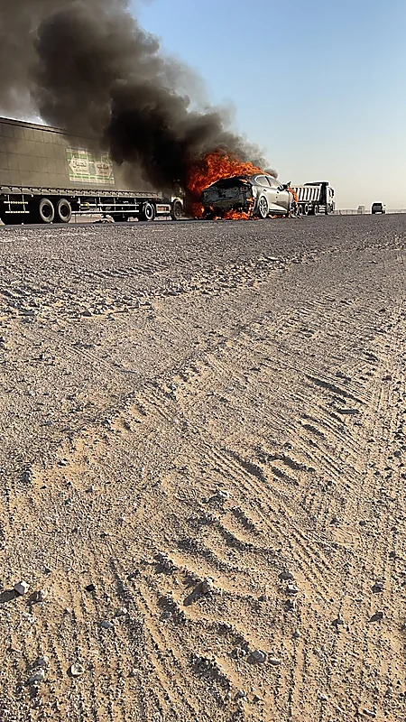 اشتعال مفاجئ لسيارة مواطن وسط الطريق