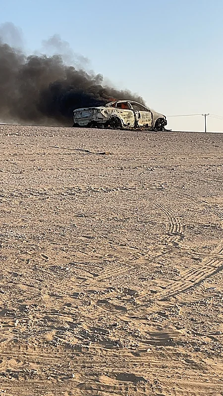 وأشار الجاسر إلى أنه كان يسير بالطريق، وفجأة سمع صوت انفجار بالسيارة، وبعد توقفه تفاجأ باحتراقها، قائلا: "امشي وفجاة صوت انفجار، وقفت الا السيارة تحترق".