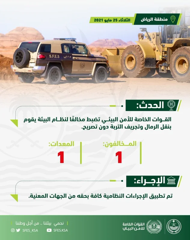 ضبطت القوات الخاصة للأمن البيئي مخالفًا لنظام البيئة يقوم بنقل الرمال وتجريف التربة دون تصريح في منطقة الرياض.