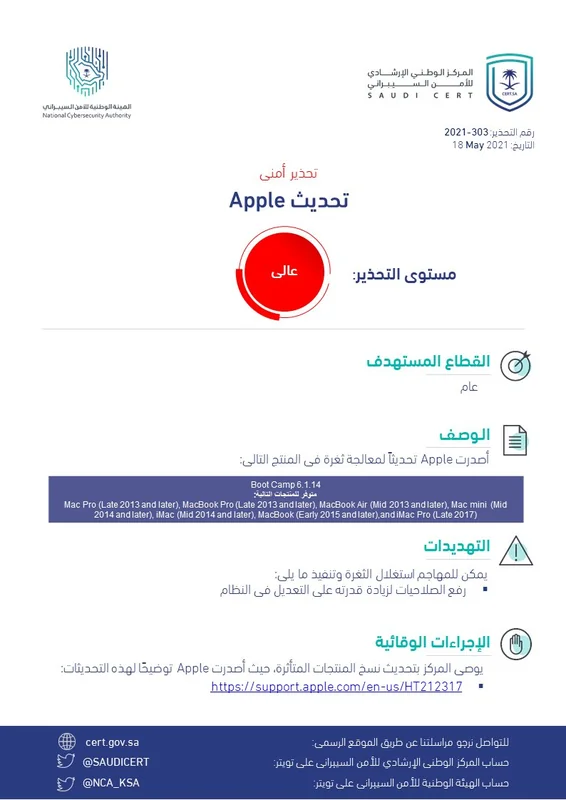 أصدر المركز الوطني الإرشادي للأمن السيبراني ، اليوم الثلاثاء، تحذير عالي الخطورة بشأن تحديث apple