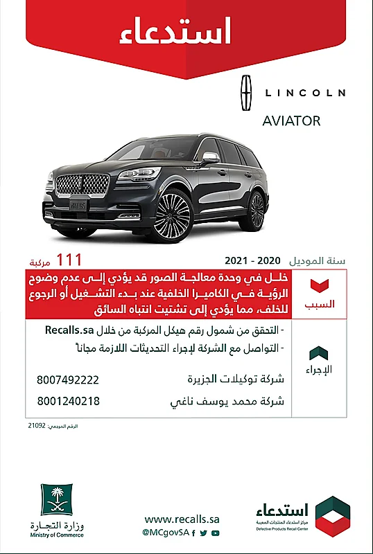 أعلنت وزارة التجارة، اليوم الأربعاء، عن استدعاء 111 مركبة لينكون "AVIATOR" موديلات 2020 - 2021.