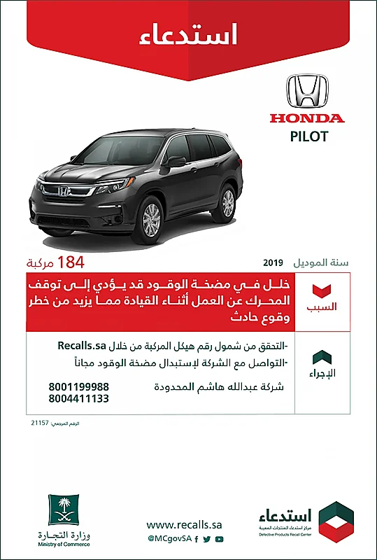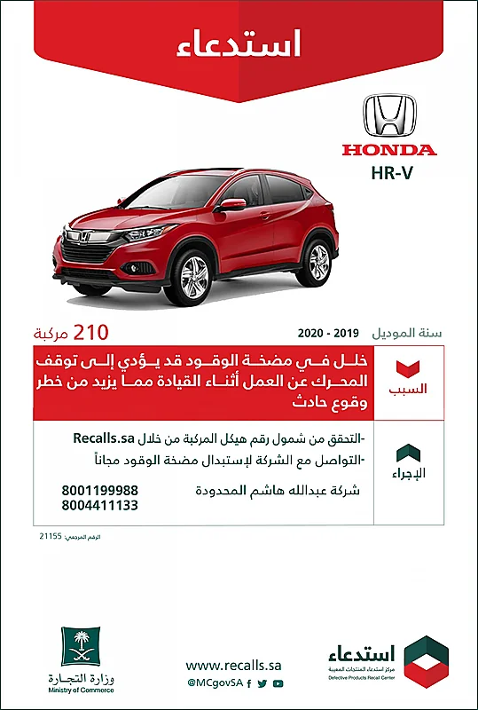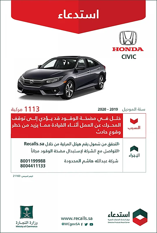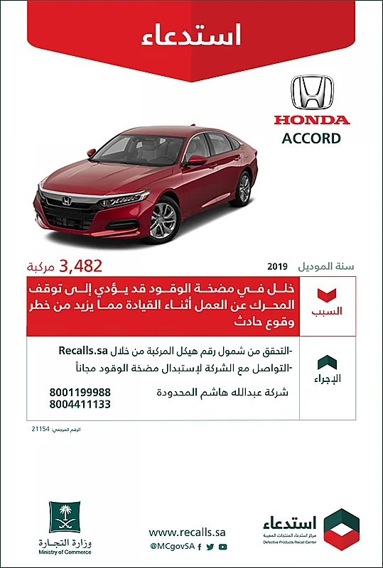 أعلنت وزارة التجارة" عن استدعاء 5,256 مركبة هوندا "ACCORD / CIVIC / HR-V / PILOT / CR-V / CITY / ODYSSEY.2019 - 2020.