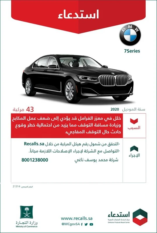 أعلنت وزارة التجارة، اليوم، عن استدعاء 43 مركبة"7Series" BMW" موديل 2020، لوجود خلل في معزز الفرامل.