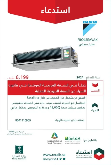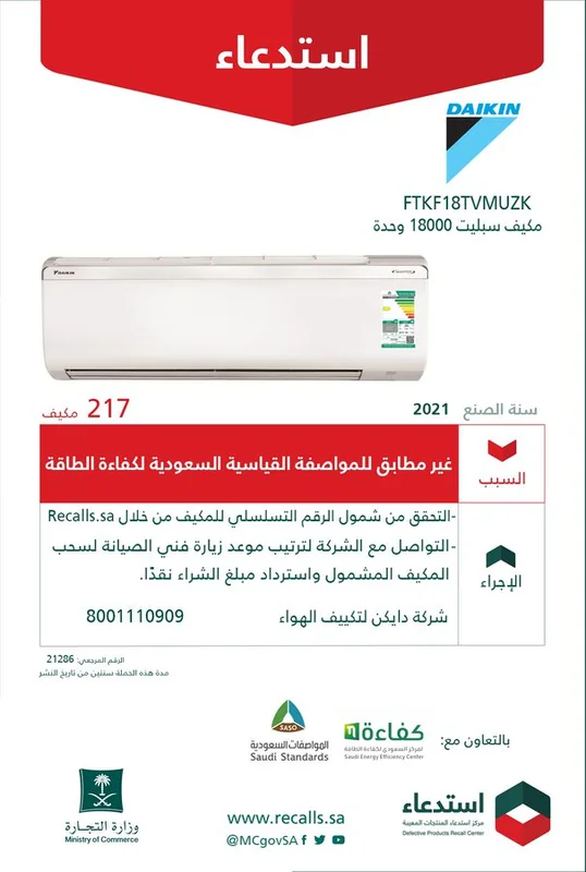 وأضافت أن استدعاء مكيفات سبليت "DAIKIN" جاء نظرًا لعدم مطابقته للمواصفة القياسية السعودية لكفاءة الطاقة، داعية مالكيها إلى التواصل مع الشركة لترتيب موعد زيارة فني صيانة لسحب المكيف واسترداد مبلغ الشراء نقدًا