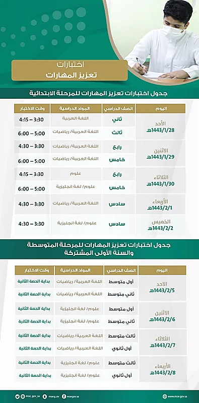 تبدأ وزارة التعليم غداً الأحد تطبيق اختبارات تعزيز المهارات في مدارس التعليم العام لجميع المراحل الدراسية، وذلك من الصف الثاني الابتدائي وحتى السنة الأولى المشتركة "الأول ثانوي".
