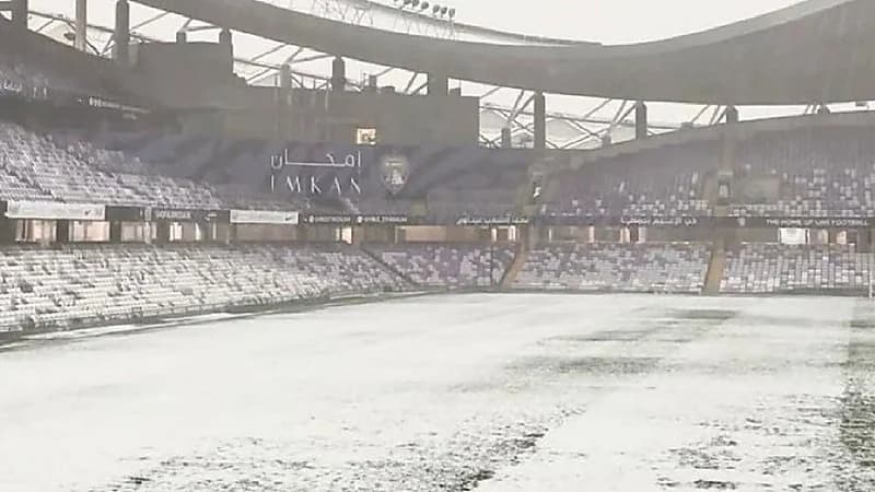 في مشهد نادر، اكتسى استاد هزاع بن زايد في مدينة العين الإماراتية، اليوم الاثنين، باللون الأبيض بعد أن غطته الثلوج.