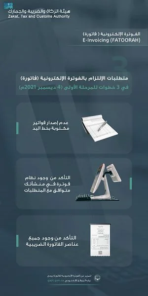حددت هيئة الزكاة والضريبة والجمارك ثلاث خطوات رئيسة للمكلفين الخاضعين للائحة الفوترة الإلكترونية، تمكنهم من الالتزام بمتطلبات المرحلة الأولى (مرحلة الإصدار والحفظ) من الفوترة الإلكترونية في الرابع من ديسمبر من العام الجاري. وتتمثل الخطوات الثلاث في التوقف التام عن استخدام الفواتير المكتوبة بخط اليد أو الفواتير المكتوبة بأجهزة الكمبيوتر عبر برامج تحرير النصوص أو برامج تحليل الأرقام، وكذلك التأكد من إصدار وحفظ الفواتير والإشعارات المرتبطة بها بصيغة إلكترونية باستخدام حل تقني متوافق مع متطلبات الفوترة الإلكترونية، الذي يمكن أن يكون جهاز كاشير أو نظام سحابي أو من برامج تخطيط الموارد والمعروفة بـ (ERP Systems)، وغيرها من الأنظمة التقنية.