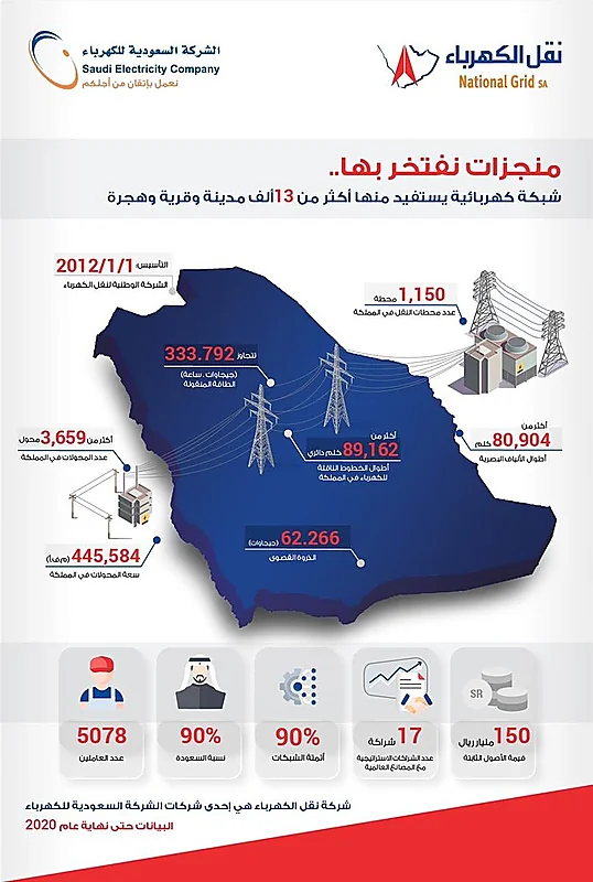 نجحت الشركة الوطنية لنقل الكهرباء التابعة للشركة السعودية للكهرباء في الوصول بأطوال الشبكة إلى أكثر من 89 ألف كم دائري لنقل 333 ألف جيجاوات / ساعة من الطاقة الكهربائية إلى أكثر من 13 ألف مدينة وقرية وهجرة خلال عام 2020.