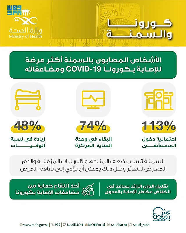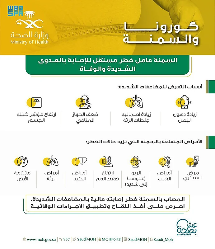 ونشرت "الصحة" عبر حسابها في تويتر ومنصتها التوعوية "عش بصحة" إنفوجرافيك للتعريف بمخاطر السمنة والأمراض المصاحبة جراء الإصابة بهذا المرض، مبينةً أن السمنة تسبب ضعف المناعة والالتهابات المزمنة والدم المعرض للتخثر يمكن أن تؤدي - لا سمح الله - إلى تفاقم المرض.