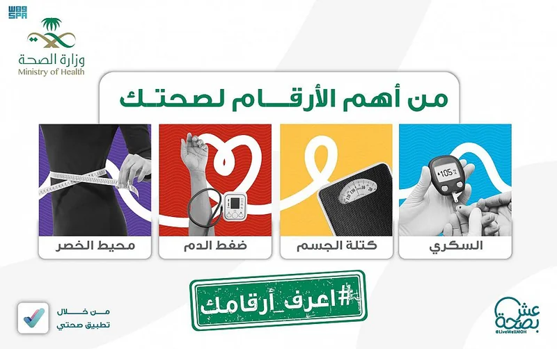 أطلقت الصحة حملة أعرف "أرقامك" التي تُعد مبادرة وطنية صحية موجهة لجميع أفراد المجتمع, وتهدف إلى التوعية بأهمية معرفة ومتابعة أبرز 4 مؤشرات حيوية تؤثر على صحة الفرد وتشمل "معدل الضغط, وقياس السكري, وقياس محيط الخصر, ورقم كتلة الجسم" .