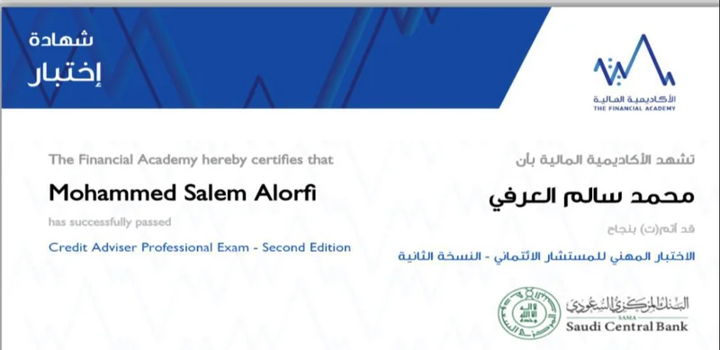اجتاز بتوفيق الله تعالى ، م محمد سالم العرفي ( المصرفي ، الإعلامي و الناشط الاجتماعي ) ” الإختبار المهني " للمستشار الإئتماني ” و المعتمد من ( البنك المركزي السعودي ) ” و حصل على شهادة الإجتياز من البنك المركزي بالتعاون مع الأكاديمية المالية ، بنجاح.