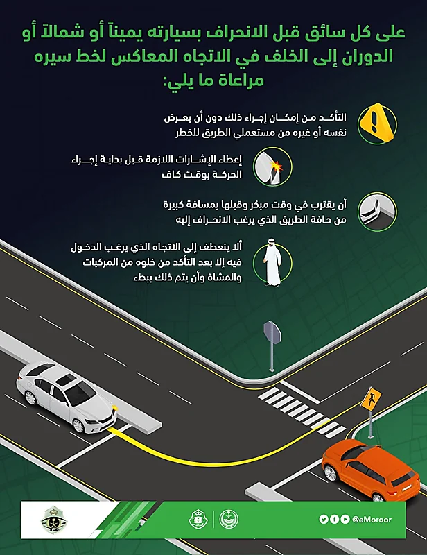 وأكدت " المرور " أنه ينبغي اتباع هذه التعليمات قبل الإنحراف يميناً أو يساراً أو بالدوران إلى الخلف في الإتجاه المعاكس لخط سيره :