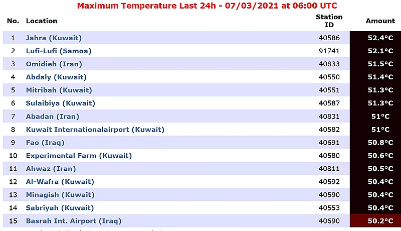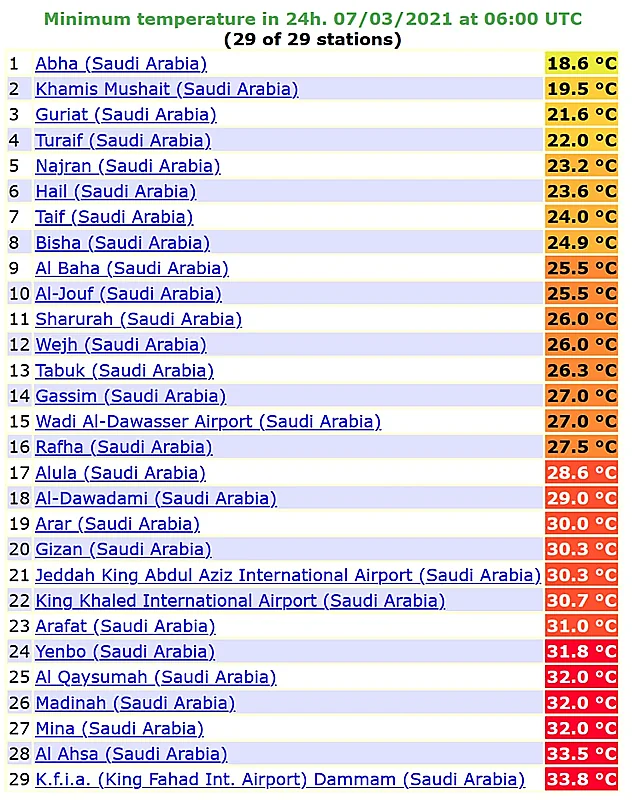 وكشف "المسند" عن قائمة بدرجة الحرارة الصغرى المسجلة فجر اليوم لـ29 محطة في المملكة، ودرجة الحرارة الكبرى ليوم أمس على مستوى العالم، فضلًا عن قائمة بأعلى درجة حرارة سُجلت خلال الـ24 ساعة الماضية.