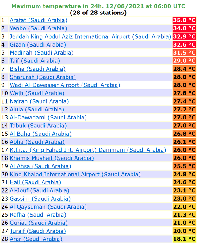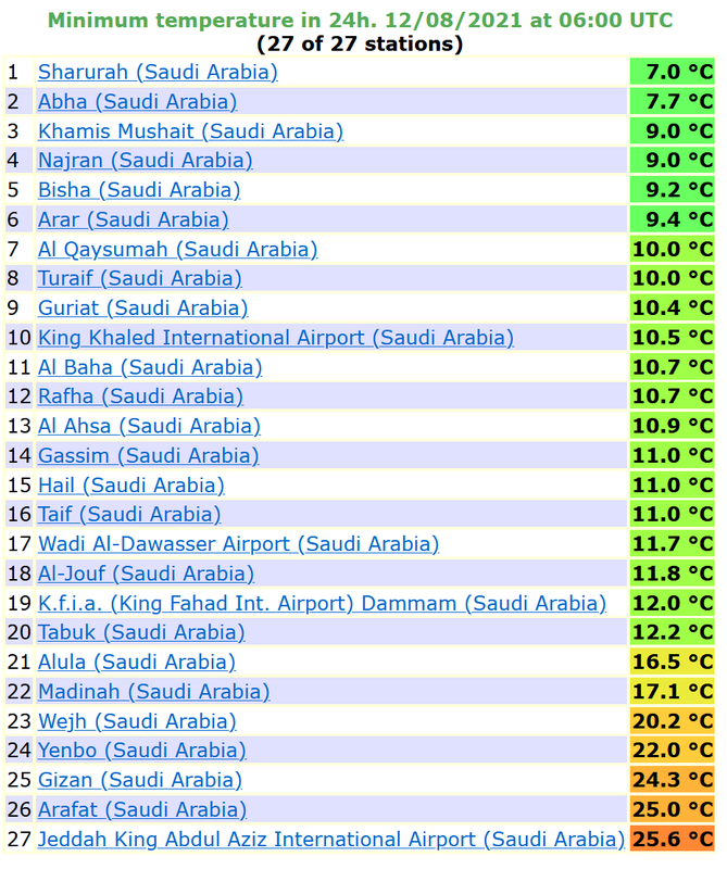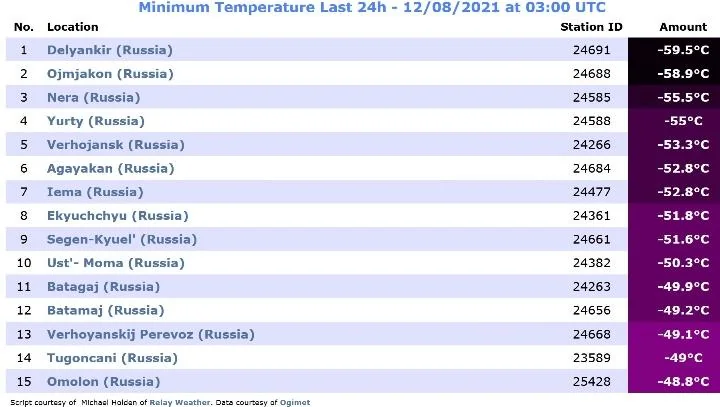 وأوضح أن شرورة تقتحم قائمة الصدارة كأبرد محافظة فجر اليوم (7 م)، فيما كشف عن قائمة بدرجة الحرارة الصغرى المسجلة فجر اليوم في بعض مطارات المملكة، ودرجة الحرارة الكبرى ليوم أمس، لافتًا إلى أنه هناك 15 مدينة روسية تستحوذ على قائمة أبرد المدن العالمية خلال الـ24 ساعة الماضية، فقد سجلت مدينة Delyankir شرق روسيا 59.5 درجة مئوية تحت الصفر، بعبارة أخرى الفريزر يعتبر ميكرويف.