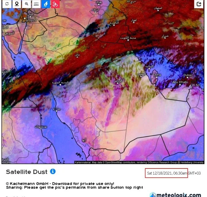 وكان المركز الوطني للأرصاد، قد توقع في تقريره عن حالة الطقس، سماء غائمة جزئياً إلى غائمة على معظم مناطق المملكة، ولا تزال الفرصة مهيأة لهطول امطار رعدية خفيفة إلى متوسطة مصحوبة برياح نشطة على أجزاء من مناطق مكة المكرمة، المدينة المنورة، حائل، القصيم، الرياض والأجزاء الشرقية من منطقة الحدود الشمالية كذلك على الأجزاء الشمالية من المنطقة الشرقية، في حين يستمر تأثير الرياح النشطة المثيرة للأتربة والغبار تحد من مدى الرؤية الأفقية على أجزاء من منطقتي الرياض والشرقية.