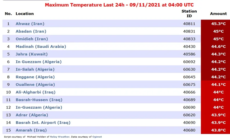وفي السياق نفسه، كشف عن قائمة بأعلى درجة حرارة سُجلت خلال الـ24 ساعة الماضية على مستوى العالم.