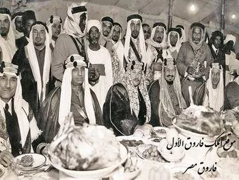 كما ظهر "الملك فاروق" في إحدى الصور وهو يرتدي الزي الخليجي أثناء تناوله الطعام برفقة الملك عبدالعزيز.