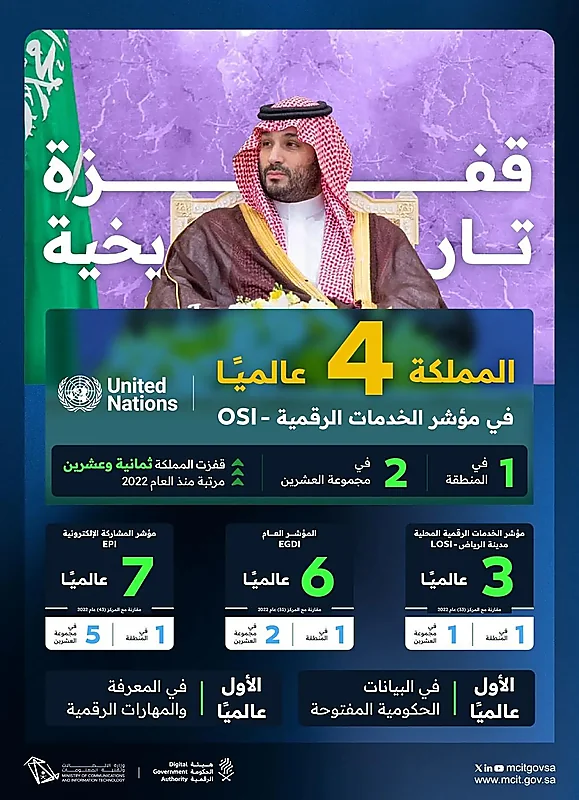 قفزت المملكة 25 مرتبة في مؤشر الأمم المتحدة لتطور الحكومة الإلكترونية 2024، لتكون ضمن مجموعة الدول الرائدة على مستوى العالم.
