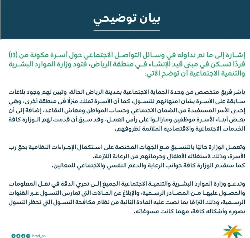 وقالت "الموارد البشرية":" فريق متخصص من وحدة الحماية الاجتماعية بالرياض باشر الحالة، وتبين لهم وجود بلاغات سابقة على الأسرة بشأن امتهانهم للتسول، كما أن الأسرة تملك منزلًا في منطقة أخرى".