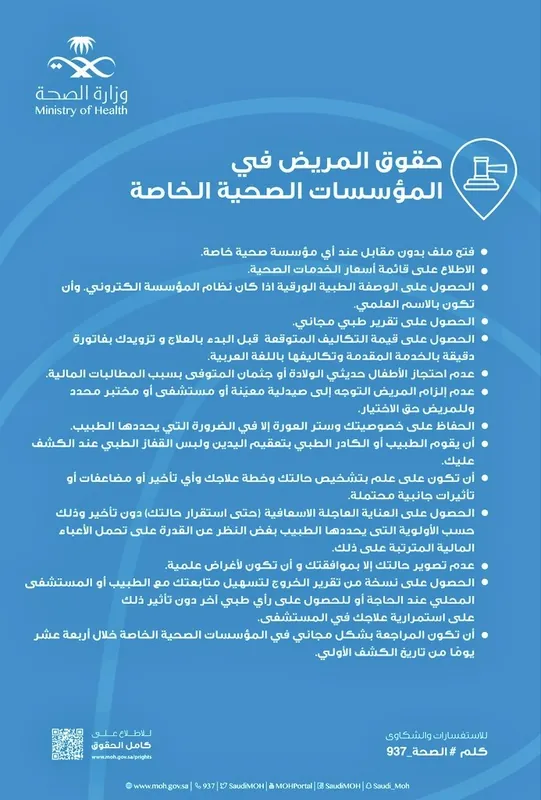 كما يجب على المستشفيات الخاصة عدم إلزام المريض بالذهاب إلى صيدلية معينة أو مستشفى معية أو مختبر معين وأن تكون المراجعة مجنية في المؤسسات الصحية الخاصة خلال الـ 14 يوم من تاريخ الكشف الأول .