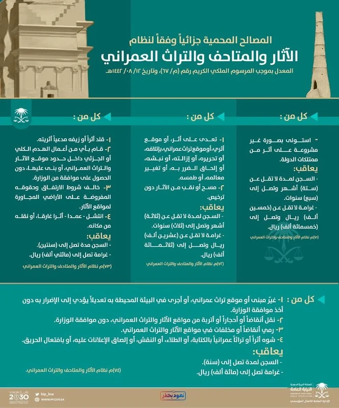 كما يعاقب كل من تعدى على أثر أو موقع أثري أو مواقع تراث عمراني بإتلاف أو تحريره أو إزالته أو نبشه أو تغيير ملامحه أو تنقيب عن الآثار بدون ترخيص بالسجن مدة لا تقل عن 3 شهور وتصل إلى 3 سنوات ، وغرامة لا تقل عن 20 ألف ريال وتصل إلى 300 ألف ريال .
