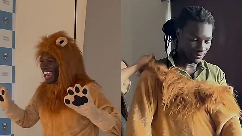 وجاء غوميز وهو يرتدي زي الأسد، وتقمص الدور، وجلس على يديه ورجليه، مقلدًا الأسد، وسط ضحك الجميع حوله، وسعادته بهذه التجربة.