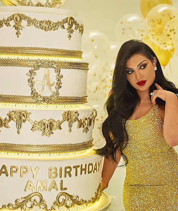 ونشرت أمل العوضي، مقطع فيديو يظهر الكيك الخاص بعيد ميلادها الذي تكون من 4 طبقات، مزينة باللون الذهبي، مع مجسم حصان على الطبقة العليا، واختارت الزهور باللون الأبيض والأصفر لتزيين الكيك، بالإضافة إلى بلالين باللون الأصفر الذهبي والأبيض أيضًا.