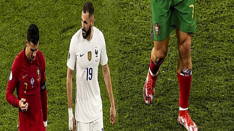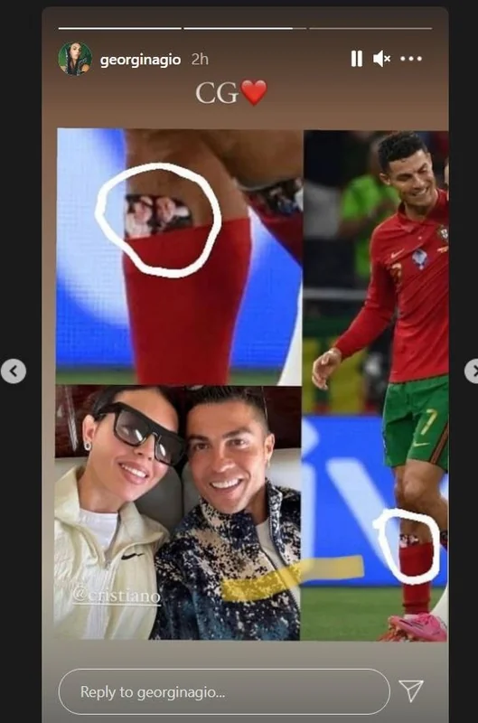 وظهر "رونالدو" وهو يرتدي واقي الساق المخصص له في مبارة البرتغال ضد فرنسا لتبدو صورته وجوروجينا على "واقي الساق" أثناء حديثه مع كريما بنزيما.
