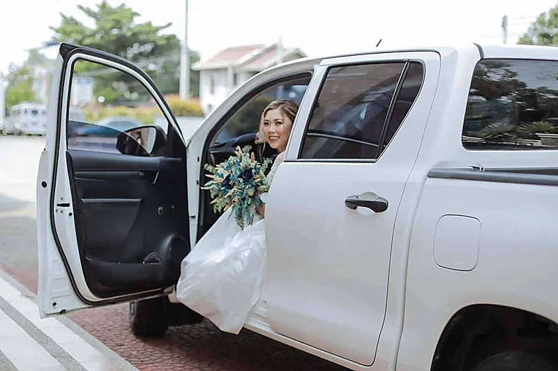 وأشارت إلى أن كان عليها أن تضع ذيل الفستان، الذي يبلغ طوله حوالي 3 أمتار، على مقعد الراكب المجاور لها، كما كان عليها أن ترتدي شبشبًا قلابًا أثناء قيادة سيارة عائلتها البيضاء ذات ناقل الحركة اليدوي.