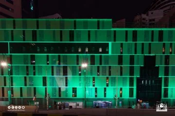 تزينت واجهة المبنى الإداري للرئاسة العامة لشؤون الحرمين، بمكة المكرمة، ومبنى مكتبة الحرم المكي الشريف، ومجمع الملك عبدالعزيز لكسوة الكعبة المشرفة، ومعرض عمارة الحرمين الشريفين، بالأضواء الخضراء.