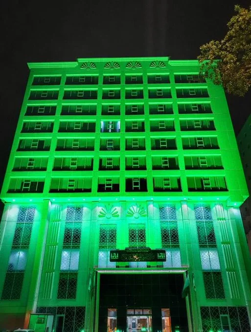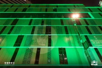 بالصور.. مبنى رئاسة شؤون الحرمين ومرافقها تتوشح باللون الأخضر