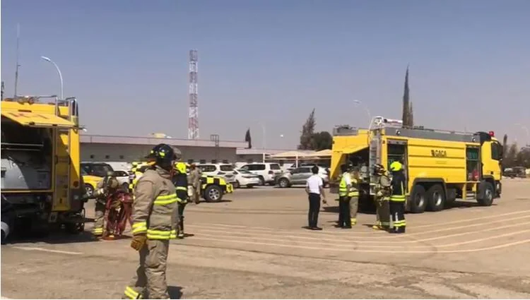 واتجهت الفرق الاطفاء والانقاذ بقيادة فهد الحربي رئيس خدمات الاطفاء والانقاذ ورئيس الفرقة المناوب وعند وصولها لموقع الحادث تمت السيطرة على الحريق وانقاذ المحتجزين داخل المبنى مع المحافظة على الارواح والممتلكات وتمت عملية تنظيم الناجين الى منطقة التجمع التي عدت مسبقاً كأجراء أحترازي في حالات الطوارئ وعند الفحص تبين أحد الموظفين بأصابته بأختناق شديد وتم نقله الى مركز صحي المطار . وبعد ذلك انتهت حالة الطوارئ وعادت عربات الاطفاء والانقاذ الى مركزها وبعد الحادثة مباشرة بأشرت التحقيقات من قبل المختصين بالمطار عن اسباب الحريق وتبين أن الحريق ناتج عن التماس كهربائي بأحد أجهزة المبنى.