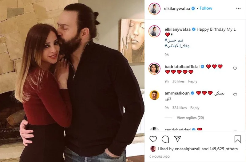 ونشرت وفاء الكيلاني صور لها مع زوجها وهو يضع قبلة على خدها، معلقة "عيد ميلاد سعيد يا حبيبي"