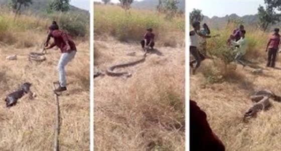 بالفيديو.. أهالي يجبرون ثعبان على تقيؤ كلب ابتلعه