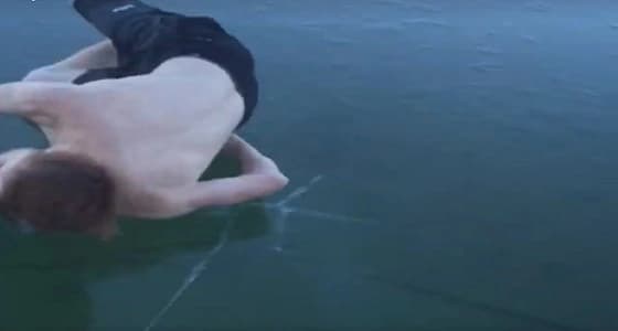 سقط شاب بطريقة مروعة عندما حاول القفز داخل حمام سباحة تحولت المياه فيه إلى جليد ما عرضه لموقف مُحرج أمام أصدقاءه .