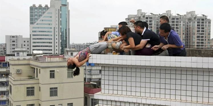 وثق مقطع فيديو لمواطن صيني أنقذ زوجته بعد أن أمسكها من شعرها في اللحظة الأخيرة قبل وقوعها في محاولة انتحارفاشلة.
