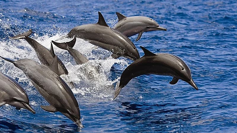 وظهرت الدلافين وهي تسبح وتعوم في البحر، ووتجول حول القارب الذي كان عليه عدد من الأشخاص.