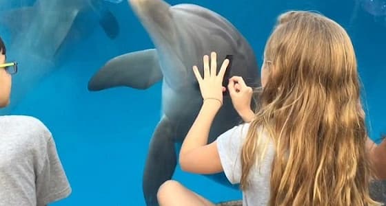 نجحت فتاة أمريكية في جذب انتباه مجموعة من الدلافين باستخدام مشط بحديقة أورلاندو البحرية الأمريكية .