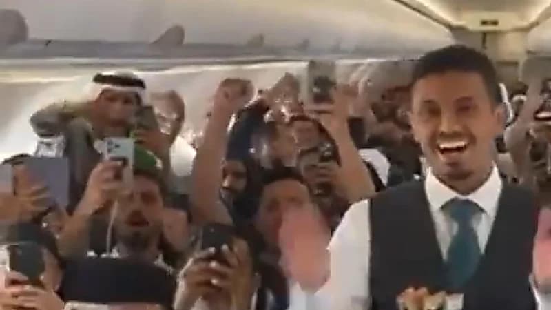 وبيّن المقطع الطيار وهو يقول :" ألف ألف مبروك فوز المنتخب السعودي على الأرجنتين 2/1 "، لقيوم المسافرين بالتشجيع والصراخ فرحًا .