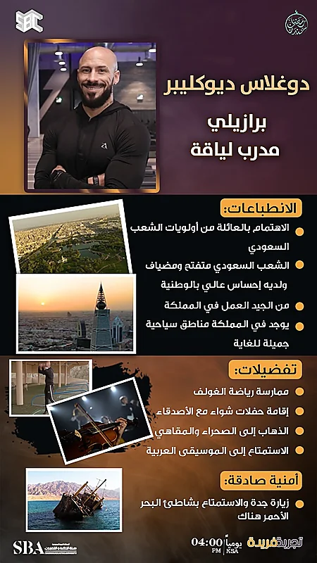 تحدث مدرب اللياقة البرازيلي دوغلاس ديوكليبر،عن المناطق السياحية التي توجد في المملكة.