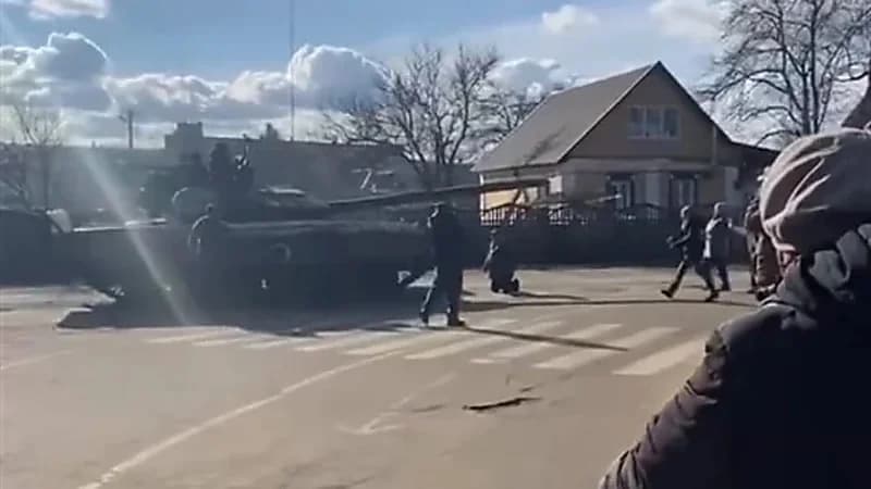 اعترض مواطن أوكراني دبابة روسية أثناء تحركها في تصرف وصفه المتابعين بأنه "شجاع".